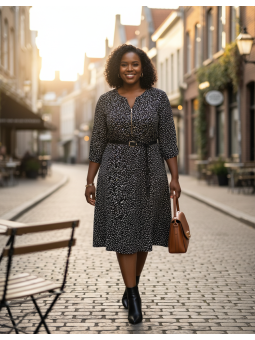 Elevate your wardrobe with this timeless faux-wrap dress, a perfect blend of classic charm and modern versatility. The playful black and white polka dot pattern combined with a universally flattering silhouette ensures you look polished and feel comfortable from day to night.