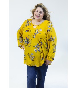 Yellow top with floral print. Elastic sleeves and key-hole cut out neckline detail.