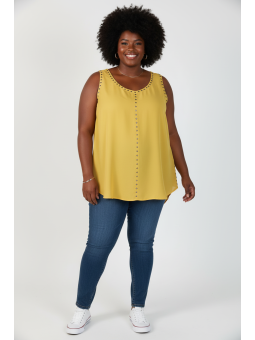 Elevate your look with this vibrant mustard yellow tunic, a perfect blend of edgy detail and effortless style. Features eye-catching stud or grommet accents along the neckline and side seams for a touch of rocker-chic style.