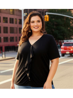 Crafted in a versatile black hue, this short-sleeve knit top features elegant ruffled and ruched detailing cascading down the front, adding a touch of texture and visual interest. The flattering V-neckline offers a classic and comfortable fit, perfect for both professional and casual settings.